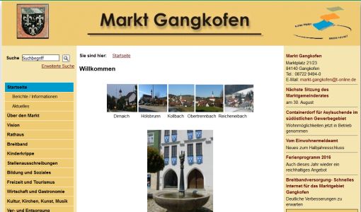 Die Markt-Gemeinde Gangkofen (Postleitzahl D-84140) im Landkreis Rottal-Inn liegt im sanften Tal der Bina. Die Gemeindeteile von Gangkofen sind: Abessen, Aich, Albanöd, Angerbach, Apfelthann, Asbach, Atzing, Au, Aurolfing, Baumgarten, Bergmeier, Bermering, Binamühl, Birding, Blankenöd, Bleibrunn, Brandstetten bei Reicheneibach, Brandstetten bei St. Nikola, Bruck, Brückl, Bubenöd, Buchberg, Butzenbach, Deingrub, Dirnaich , Dörfl, Ecken, Edeneibach, Edenkatzbach, Edgarten, Elsenberg, Engersdorf, Eppen, Eselberg, Fatzöd, Feld, Flexöd, Forst, Freiling, Fuchsberg, Fußöd, Gangkofen , Gattersteig, Geiging, Geiselberg, Gengham, Giglöd, Gindering, Goldbrunn, Grammelsberg, Grub bei Obertrennbach, Grub bei Reicheneibach, Gruber, Hackenberg, Haselthann, Heck, Heiligenbrunn, Heiligenstadt, Hermannsöd, Hintergindering, Hinterreisach, Hinzing, Hochwimm, Hofwimm, Höhhaus, Hölsbrunn , Holzhäuseln, Holzreit, Holzwoferl, Hopfloh, Hub, Huttenkofen, Irlach, Kager, Klorberg, Kobl bei Nutzbach, Kobl bei Reicheneibach, Kolbeck, Kollbach , Kottenöd, Kurmer, Langenkatzbach, Leitl, Limmer, Linn, Linnöd, Lukasöd, Magassing, Mailing, Maisberg, Malling, Mandl, Marastorf, Matzing, Mitterschmiddorf, Niedertrennbach, Nußbaumöd, Nutzbach, Oberalmsham, Oberauersberg, Oberbachham, Oberndorf, Oberried, Oberschmiddorf, Obertrennbach , Oberviehhausen Öd Ofen, Ottenöd, Pading, Panzing, Pavenzing, Pechhäusl, Plaikamühle, Racksdorf, Radlkofen, Rauschöd, Reicheneibach , Riebersberg, Riemberg, Rohrach, Rußbrenner, Sackstetten, Sankt Nikola, Satzing, Saueröd, Schattenkirchen, Schelnlohe, Scherzlthambach, Scheuering, Schmiedsberg, Schmiedsöd, Schnatzling, Schöfthal, Schönhub, Schönviehhausen, Schrettenbrunn, Schröll, Seemannshausen, Seereit, Sesselsberg, Siebengadern, Sölgerding, Spielberg, Spitzgrub, Stadlhof, Stauern, Steinberg, Stockach, Straß, Stubengrub, Taubendorf, Thalkofen, Unteralmsham, Unterauersberg, Unterbachham, Unterholzen, Unterschmiddorf, Uttendorf, Vohberg, Vorderreisach, Vorrach, Weiher, Wickering, Wiedersbach, Wiesbach, Wiesen, Wimmersdorf, Wintersberg, Wöhr und Wüst.